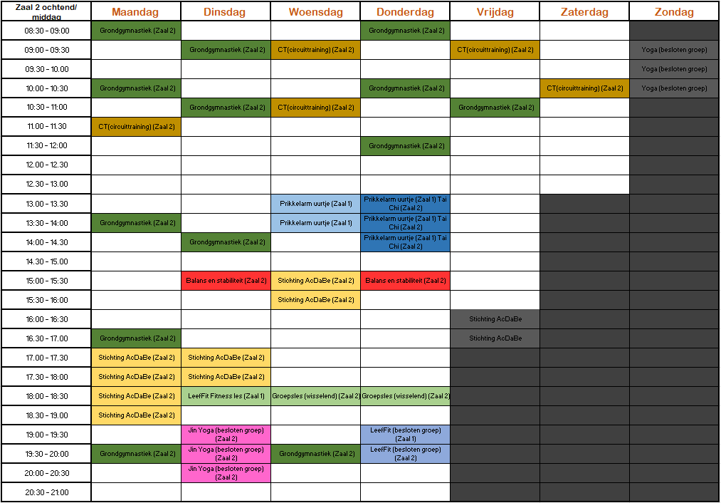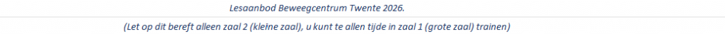 Lesrooster kleine zaal, let op dit betreft alleen de kleine zaal (zaal 2), u kunt te allen tijde in de grote zaal met apparaten (zaal 1) trainen: